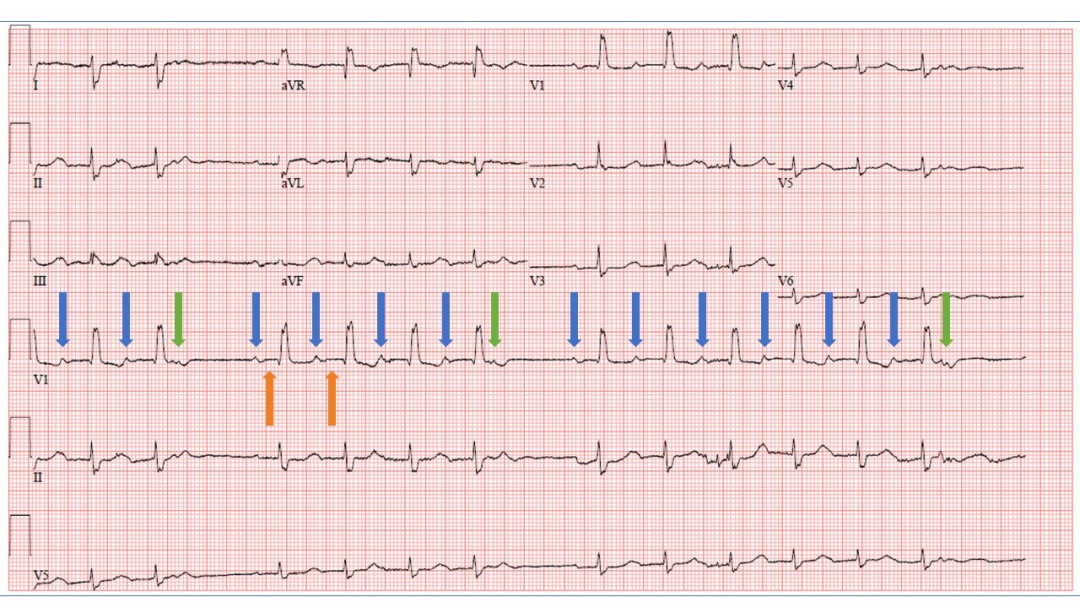 根据这份心电图,您会怎么诊断呢?是Ⅱ度1型房室传导阻滞?Ⅱ度2型房室传导阻滞?窦性心律并早搏?还是心房颤动?这份心电图提示窦性心律并I度房室传导阻滞,房性早搏以及房性早搏伴代偿间歇。整份心电图中可见窦性P波(蓝色箭头所指处即为窦性P波,见图2),其后跟随的QRS波群亦清晰可见。图中可见多发的房性早搏,早博的波群在V1导联更加清晰易见,其中第三个和第七个早搏波埋藏在T波中(图2绿色箭头所指处即为包埋有P’波的T波)。这些多发的房早没有下传到心室,因为房性早搏下传到房室结的时候正好遇上它的绝对不应期。随后的窦性P波被延迟并形成代偿间歇。代偿间歇后由于房室结传导衰减,因此心电图表现为第一个PR间期短于第二个PR间期(图2黄色箭头所指处,)