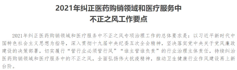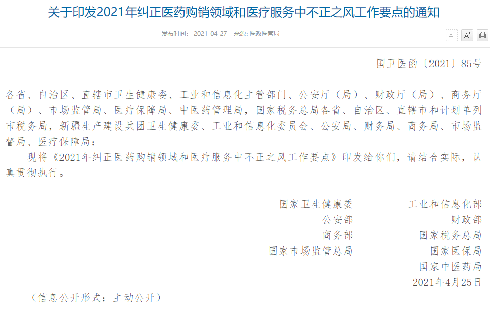 近期,国家卫生健康委员会、工业和信息化部、公安部、财政部、商务部、国家税务总局、国家市场监督管理总局、国家医疗保障局、国家中医药管理局等九部委联合印发了《关于印发2021年纠正医药购销领域和医疗服务中不正之风工作要点的通知》。