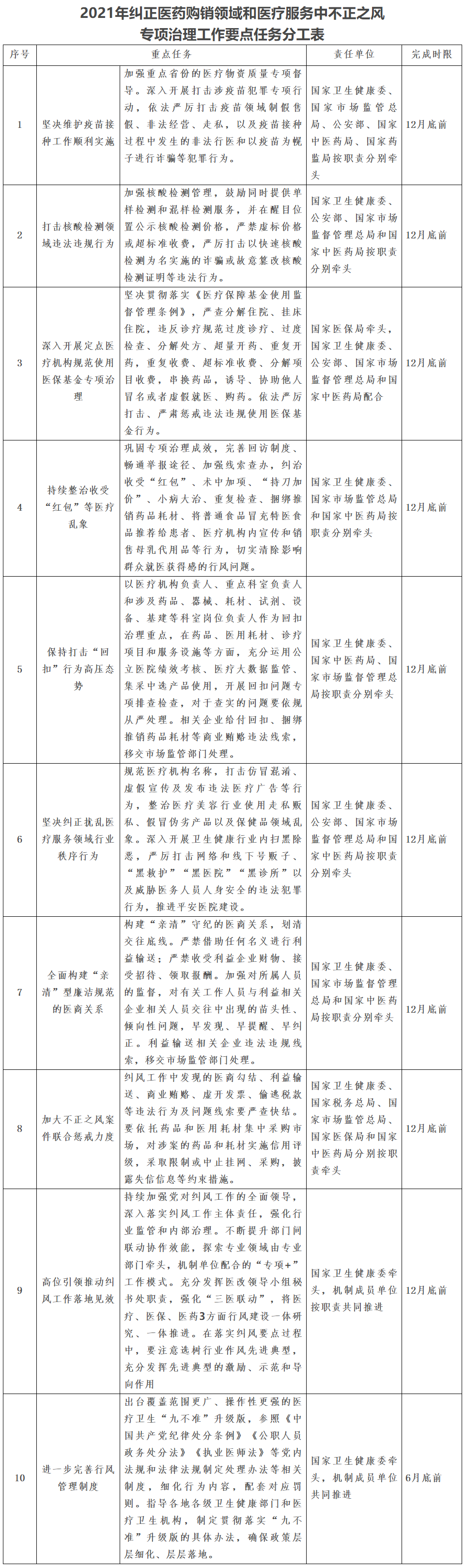 附件:2021年纠正医药购销领域和医疗服务中不正之风专项治理工作要点任务分工表
