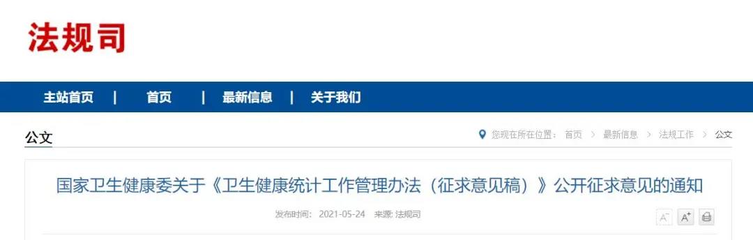 近日,国家卫健委印发《卫生健康统计工作管理办法(征求意见稿)》(以下简称《征求意见稿》)公开征求意见的通知。