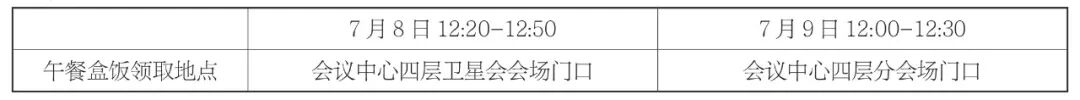 现场报到后凭本人身份证领取午餐盒饭券(7月8日-7月9日)。请凭餐券到指定地点用餐。大会不提供晚餐。