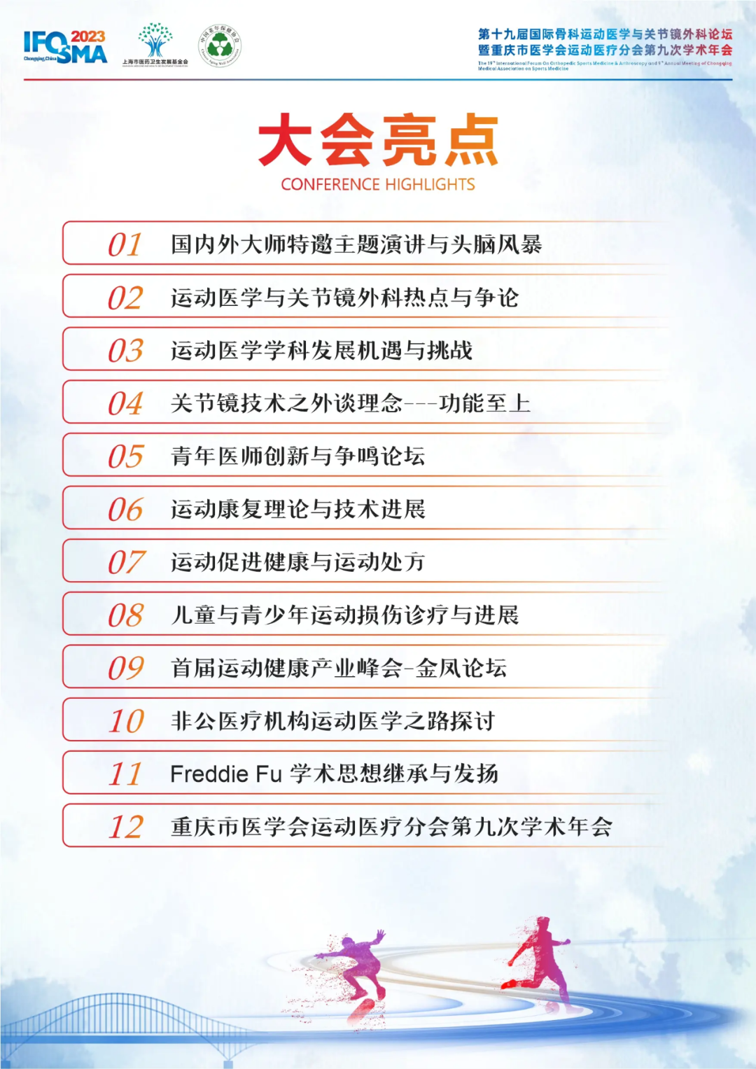 为持续推进中国运动医学发展,第19届IFOSMA将于2023年10月19-22日(周四-周日)在重庆市举办。大会将继续秉承并弘扬运动医学“功能至上、早期康复、重返运动”的宗旨,围绕当今骨科运动医学的相关热点和难点进行专题讨论。