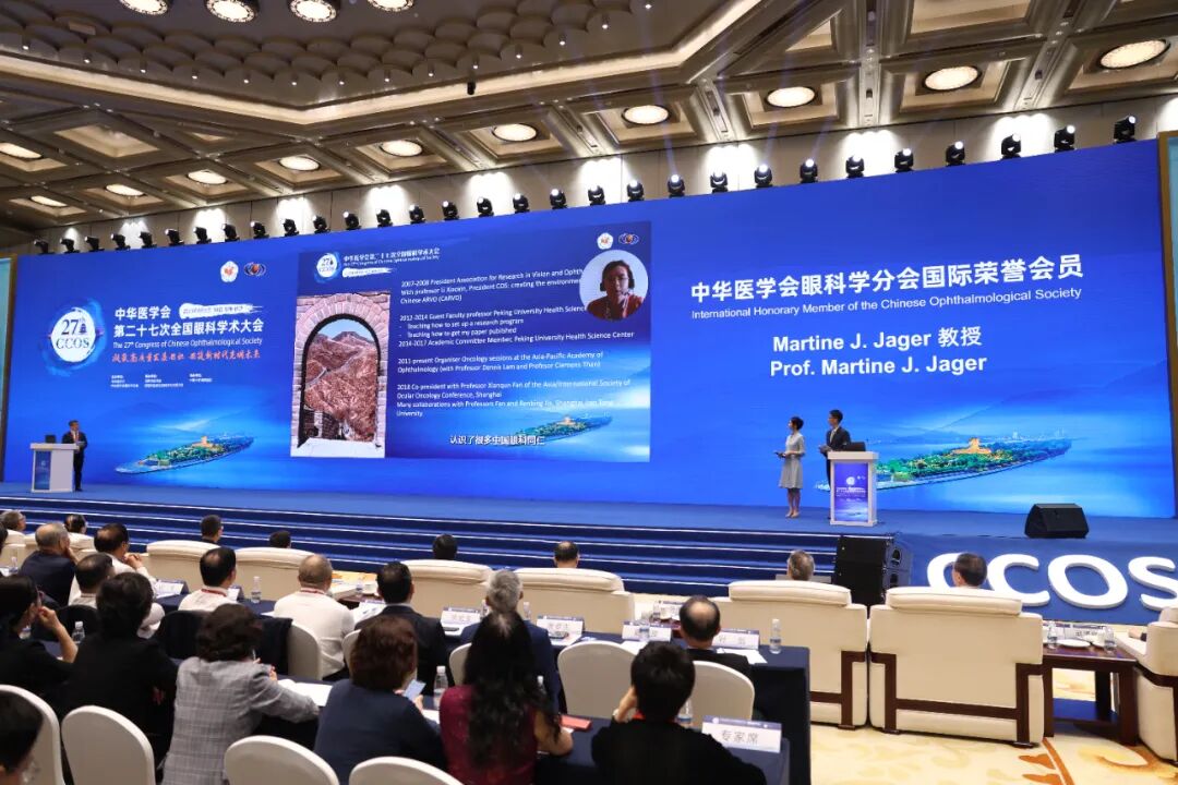 姚克主任委员上台为荷兰莱顿大学医学中心Martine J.Jager 教授、日本筑波大学的Tetsuro OSHIKA教授授予中华医学会眼科学分会国际荣誉会员。