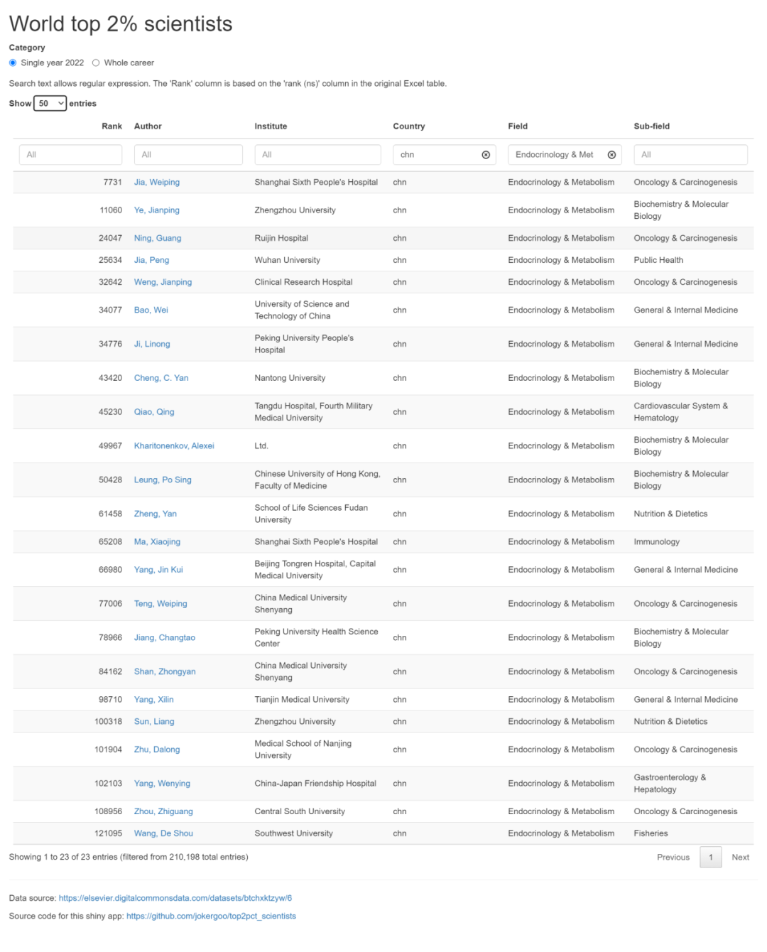 近日,美国斯坦福大学发布了2023年度“全球前2%顶尖科学家榜单”,我国内分泌及代谢领域多位专家入围“年度科学影响力”榜单(下表)。