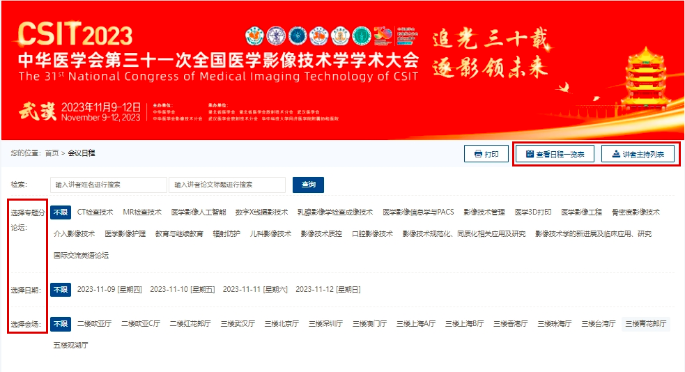 右上角点击【查看日程一览表】【讲者主持列表】也可进入相应查询界面,如下图示: