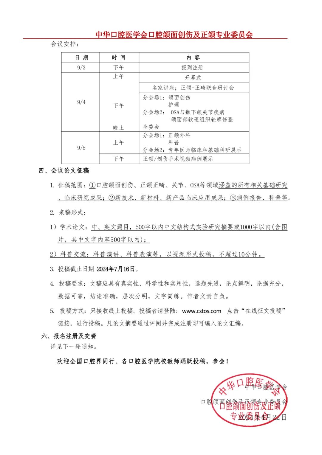 我们诚挚的邀请您参加“口腔颌面创伤及正颌专业委员会第4次学术会议”,本次会议与中华口腔医学会第26次全国口腔医学学术会议同期举办。本次会议旨在推动口腔颌面 创伤、正颌、正畸、口腔睡眠医学和颞颌关节等领域的交流和发展,为广大口腔医学工作 者提供一个共同学习和探讨的平台。本次大会精心设计了名家讲堂、专题学术演讲、疑难 病例MDT交流、科普作品交流、正颌手术视频展示等项目,形式多种多样,内容丰富。热切 期待和欢迎全国各地口腔同仁踊跃报名、积极参会!