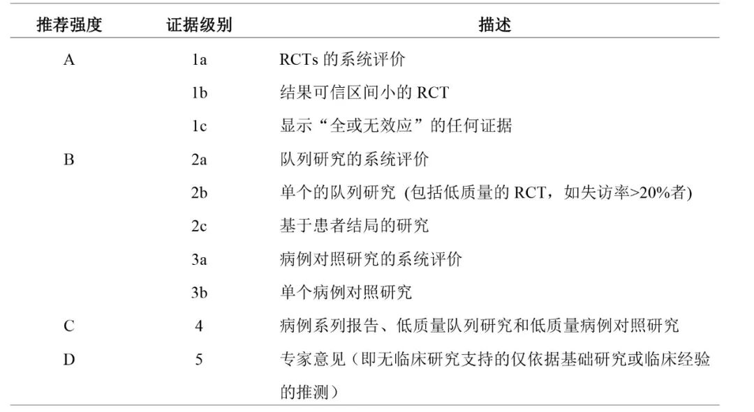 证据分级和推荐强度分级:本指南采用2009牛津大学证据分级与推荐意见强度分级标准对推荐意见的支持证据体进行评级(表1)。