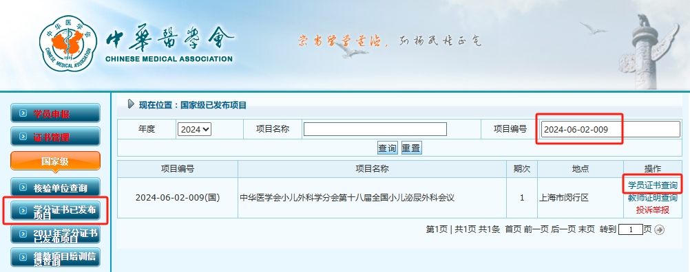 3. 点击左侧“国家级”栏目下的“学分证书已发布项目”按钮,年度选择“2024”,项目编号输入“2024-06-02-009”,点击查询后,点击“学员证书查询”按钮,如下图示: